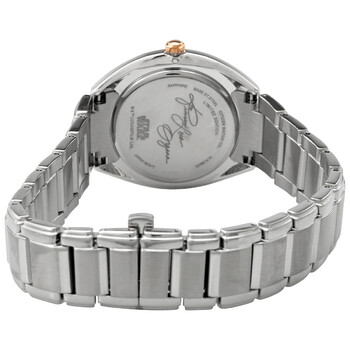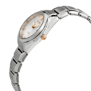 Stainless steel case with a stainless steel bracelet. Fixed stainless steel bezel set with diamonds. Silver dial with luminous rose gold-tone hands and dot hour markers. The Rebel alliance symbol appears at the 12 o'clock position. Dial Type: Analog. Luminescent hands. Date display at the 3 o'clock position. Citizen caliber Eco-Drive E013 eco-drive movement. Scratch resistant sapphire crystal. Pull / push crown. Solid case back. Round case shape. Case size: 32 mm. Case thickness: 7.7 mm. Band width: 16 mm. Deployment clasp with a push button release. Water resistant at 50 meters / 165 feet. Functions: date, hour, minute, second, solar-powered. Princess Leia Series. Dress watch style. Watch label: Japan Movt. Citizen Princess Leia Diamond Silver Dial Ladies Watch EW2251-81W.