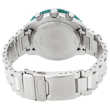 Silver-tone stainless steel case and bracelet. Bi-directional rotating green stainless steel bezel. Green dial with silver-tone hands and index hour markers. Minute markers around the outer rim. Dial Type: Analog. Luminescent hands and markers. Date display at the 4 o'clock position. Three sub-dials displaying: 24 hour, day/60 second/power reserve indicator , mode. Citizen Caliber E660 eco-drive movement. Scratch resistant sapphire crystal. Screw down crown. Solid case back. Round case shape, case size: 46 mm, case thickness: 13.7 mm. Band width: 26.87 mm. Fold over clasp with a safety release. Water resistant at 200 meters / 660 feet. Functions: perpetual calendar, atomic timekeeping, radio controlled, chronograph, world time, alarm, date, day, GMT, second time zone, hour, minute, second, power reserve indicator, solar-powered. Promaster Air A-t Series. Sport watch style. Watch label: Japan Movt. Citizen Promaster Air A-T World Time Chronograph GMT Green Dial Men's Watch CB5004-59W.