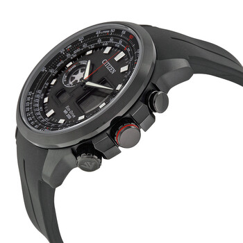 Black ion-plated stainless steel case with a black polyurethane strap. Fised black ion-plated bezel. Black dial with black hands and index hour markers. Minute markers. Fuel consumption scale around the outer rim. Dial Type: Analog-digital. Mode indicator. Eco-drive movement. Scratch resistant mineral crystal. Solid case back. Case diameter: 47 mm. Round case shape. Tang clasp. Water resistant at 200 meters / 660 feet. Functions: chronograph, hour, minute, second, perpetual calendar, alarm, digital display. Sport watch style. Watch label: Japan Movt. Citizen Promaster Air Black Dial Men's Watch JZ1065-13E.