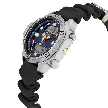 Silver-tone stainless steel case with a black rubber strap. Uni-directional rotating silver-tone stainless steel bezel. Blue dial with red skeleton hands and index hour markers. Minute markers around the outer rim. Dial Type: Analog-digital. Luminescent hands and markers. Full auto calendar. 1/100 second chronograph subdials. Quartz movement. Scratch resistant mineral crystal. Screw down crown. Solid case back. Round case shape. Case size: 44 mm. Buckle clasp. Water resistant at 200 meters / 660 feet. Functions: date, day, hour, minute, second,full auto calendar, alarm,depth alarm,underwater depth display down to 260 feet. Sport watch style. Watch label: Japan Movt. Citizen Promaster Aqualand Alarm Quartz Analog-Digital Blue Dial Men's Watch JP1010-00L.