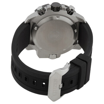 Stainless steel case with a black polyurethane strap. Uni-directional rotating stainless steel bezel with an inlaid black and green ring. Black dial with luminous silver-tone and orange hands and index hour markers. Minute markers around the outer rim. Dial Type: Analog. Luminescent hands and markers. Date display at the 3 o'clock position. Chronograph - three sub-dials displaying: small seconds, 60 minute and 24 hour. Citizen caliber B740 eco-drive movement. Scratch resistant sapphire crystal. Screw down crown. Solid case back. Round case shape. Case size: 50 mm. Case thickness: 15.8 mm. Tang clasp. Water resistant at 200 meters / 660 feet. Functions: chronograph, date, hour, minute, second. Promaster Aqualand Series. Sport watch style. Watch label: Japan Movt. Citizen Promaster Aqualand Chronograph Black Dial Men's Watch BJ2168-01E.