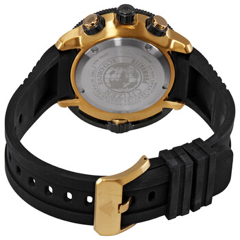 Gold-tone stainless steel case with a black silicone strap. Uni-directional rotating gold-tone and blue bezel. Black and blue dial with luminous gold-tone hands and index hour markers. Minute markers around the outer rim. Dial Type: Analog. Luminescent hands and markers. Date display at the 3 o'clock position. Citizen caliber B740 eco-drive movement. Scratch resistant mineral crystal. Screw down crown. Solid case back. Round case shape. Case size: 49 mm. Case thickness: 15 mm. Tang clasp. Water resistant at 200 meters / 660 feet. Functions: chronograph, date, hour, minute, second, stopwatch to 50 minutes. Promaster Aqualand Series. Dive watch style. Watch label: Japan Movt. Citizen Promaster Aqualand Chronograph Eco-Drive Men's Watch BJ2124-14E.