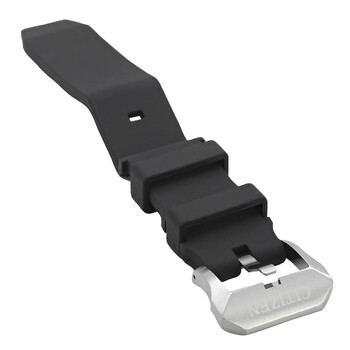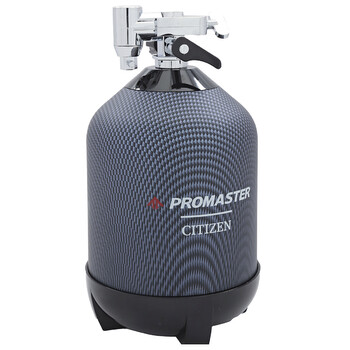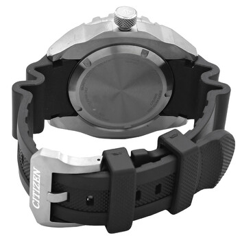 Silver-tone titanium case with a black rubber strap. Uni-directional rotating black titanium bezel. Black dial with silver-tone hands and index hour markers. Minute markers around the outer rim. Dial Type: Analog. Luminescent hands and markers. Date display at the 3 o'clock position. Citizen Caliber 9051 automatic movement with a 40-hour power reserve. Scratch resistant sapphire crystal. Screw down crown. Solid case back. Round case shape, case size: 46 mm, case thickness: 15 mm. Band width: 20 mm. Buckle clasp. Water resistant at 200 meters / 660 feet. Functions: date, hour, minute, second. Promaster Series. Dive watch style. Watch label: Japan Movt. Citizen Promaster Automatic Black Dial Men's Watch NB6004-08E.