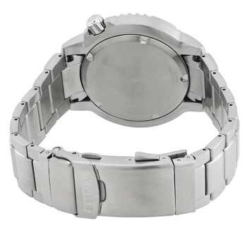 Silver-tone stainless steel case and bracelet. Uni-directional rotating silver-tone stainless steel bezel. Grey dial with silver-tone hands and index hour markers. Minute markers around the outer rim. Dial Type: Analog. Luminescent hands and markers. Date display at the 4 o'clock position. Citizen Caliber Eco-Drive E168 eco-drive movement. Scratch resistant mineral crystal. Screw down crown. Solid case back. Round case shape, case size: 44 mm, case thickness: 11.5 mm. Band width: 20 mm. Fold over clasp with a safety release. Water resistant at 200 meters / 660 feet. Functions: date, hour, minute, second, solar-powered. Promaster Dive Series. Dive watch style. Watch label: Japan Movt. Citizen Promaster Dive Eco-Drive Grey Dial Men's Watch BN0167-50H.
