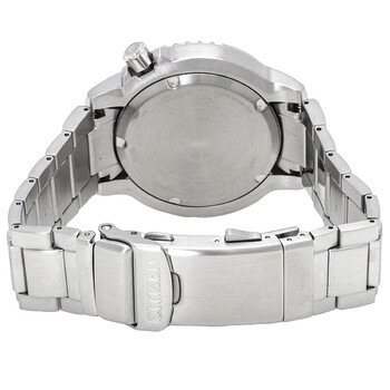 Silver-tone stainless steel case and bracelet. Uni-directional rotating silver-tone stainless steel bezel. Light blue dial with silver-tone hands and index hour markers. Minute markers around the outer rim. Dial Type: Analog. Luminescent hands and markers. Date display at the 4 o'clock position. Citizen Caliber Eco-Drive E168 eco-drive movement. Scratch resistant mineral crystal. Screw down crown. Solid case back. Round case shape, case size: 44 mm. Band width: 20 mm. Fold over clasp with a safety release. Water resistant at 200 meters / 660 feet. Functions: date, hour, minute, second, solar-powered. Promaster Dive Series. Sport watch style. Watch label: Japan Movt. Citizen Promaster Dive Eco-Drive Light Blue Dial Men's Watch BN0165-55L.