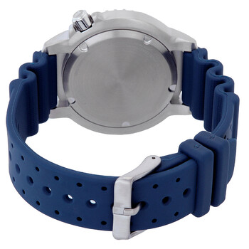 Silver-tone stainless steel case with a blue polyurethane strap. Uni-directional rotating blue stainless steel bezel. Orange dial with blue and purple hands and index hour markers. Minute markers around the outer rim. Dial Type: Analog. Luminescent hands and markers. Date display at the 4 o'clock position. Citizen Caliber Eco-Drive E168 eco-drive movement. Scratch resistant mineral crystal. Screw down crown. Solid case back. Round case shape, case size: 44 mm. Band width: 20 mm. Buckle clasp. Water resistant at 200 meters / 660 feet. Functions: date, hour, minute, second, solar-powered. Promaster Dive Series. Dive watch style. Watch label: Japan Movt. Citizen Promaster Dive Eco-Drive Orange Dial Men's Watch BN0169-03X.