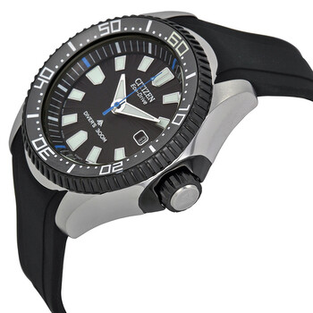 Stainless steel case with a black rubber strap. Uni-directional rotating black ion-plated bezel. Black dial with luminous hands and index hour markers. Minute markers around the outer rim. Dial Type: Analog. Luminescent hands and markers. Date display at the 3 o'clock position. Citizen Caliber Eco-Drive E168 eco-drive movement. Scratch resistant mineral crystal. Screw down crown. Solid case back. Case size: 47 mm. Case thickness: 14 mm. Round case shape. Band width: 23 mm. Band length: 8.5 inches. Tang clasp. Water resistant at 300 meters / 1000 feet. Functions: hours, minutes, seconds, date. Additional Info: suitable for scuba diving to a depth of 30 meters for up to 2 hours. Dive watch style. Watch label: Made in Japan. Item Variations: BN0085 01E, BN0085.01E, BN008501E. Citizen Promaster Diver 300 Meters Eco-Drive Black Dial Black Rubber Men's Watch BN0085-01E.