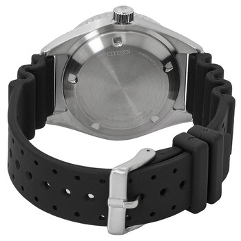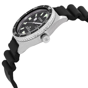 Silver-tone stainless steel case with a black rubber strap. Uni-directional rotating silver-tone stainless steel bezel with an inlaid black top ring. Black dial with silver-tone hands and index hour markers. Minute markers around the outer rim. Dial Type: Analog. Luminescent hands and markers. Day of the week and date display at the 3 o'clock position. Citizen Caliber 8204 automatic movement. Scratch resistant mineral crystal. Screw down crown. Solid case back. Round case shape, case size: 41 mm, case thickness: 13.7 mm. Tang clasp. Water resistant at 200 meters / 660 feet. Functions: date, day, hour, minute, second. Promaster Diver Series. Dive watch style. Watch label: Japan Movt. Citizen Promaster Diver Automatic Black Dial Men's Watch NY0120-01E.