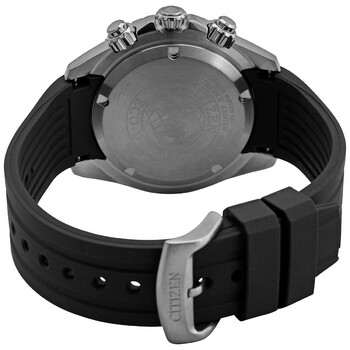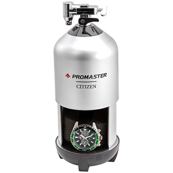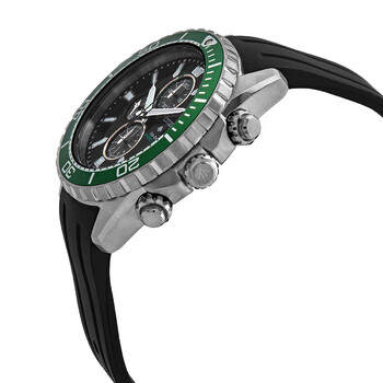 Stainless steel case with a black rubber strap. Uni-directional rotating stainless steel bezel with an inlaid green ring. Black dial with luminous silver-tone hands and index hour markers. Minute markers around the outer rim. Dial Type: Analog. Luminescent hands and markers. Date display at the 3 o'clock position. Chronograph - three sub-dials displaying: 60 second, 60 minute and 12/24 hours. B612 quartz movement. Scratch resistant mineral crystal. Screw down crown. Solid case back. Round case shape. Case size: 46 mm. Case thickness: 10 mm. Band width: 20 mm. Tang clasp. Water resistant at 200 meters / 660 feet. Functions: chronograph, date, hour, minute, second. Promaster Diver Series. Sport watch style. Watch label: Japan Movt. Citizen Promaster Diver Chronograph Black Dial Men's Watch CA0715-03E.