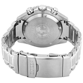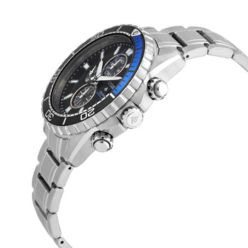 Stainless steel case with a stainless steel bracelet. Uni-directional rotating stainless steel bezel with an inlaid black and blue ring. Black dial with silver-tone hands and luminous index hour markers. Minute markers around the outer rim. Dial Type: Analog. Luminescent hands and markers. Date display at the 3 o'clock position. Chronograph - three sub-dials displaying: 60 second, 60 minute and 12/24 hours. Citizen Caliber B612 quartz movement. Scratch resistant mineral crystal. Screw down crown. Solid case back. Round case shape. Case size: 46 mm. Case thickness: 10 mm. Band width: 20 mm. Fold over clasp with a push button release. Water resistant at 200 meters / 660 feet. Functions: chronograph, date, hour, minute, second. Promaster Diver Series. Casual watch style. Watch label: Japan Movt. Citizen Promaster Diver Chronograph Quartz Black Dial Men's Watch CA0719-53E.