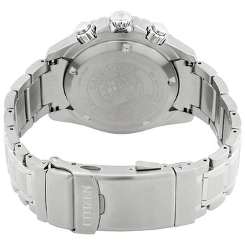 Silver-tone stainless steel case and bracelet. Blue stainless steel bezel. Blue dial with silver-tone hands and index hour markers. Minute markers around the outer rim. Dial Type: Analog. Luminescent hands and markers. Date display at the 3 o'clock position. Chronograph - three sub-dials displaying: 60 second, 60 minute and 12/24 hours. Eco-drive movement. Scratch resistant mineral crystal. Solid case back. Round case shape, case size: 46 mm. Fold over clasp. Water resistant at 200 meters / 660 feet. Functions: date, hour, minute, second. Promaster Diver Series. Sport watch style. Citizen Promaster Diver Diamond Blue Dial Men's Watch CA0710-58L.
