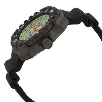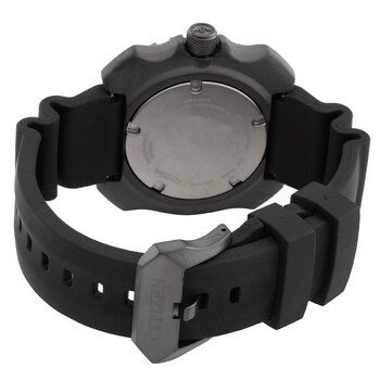 Gray super titanium case with a black polyurethane strap. Uni-directional rotating bezel. Green dial with black and orange hands and index hour markers. Minute markers around the outer rim. Dial Type: Analog. Luminescent hands and markers. Date display at the 3 o'clock position. Citizen Caliber Eco-Drive E168 eco-drive movement. Scratch resistant mineral crystal. Screw down crown. Solid case back. Round case shape, case size: 45.8 mm, case thickness: 14.3 mm. Tang clasp. Water resistant at 200 meters / 660 feet. Functions: date, hour, minute, second, solar-powered. Promaster Diver Series. Dive watch style. Watch label: Japan Movt. Citizen Promaster Diver Eco-Drive Green Dial Men's Watch BN0227-17X.