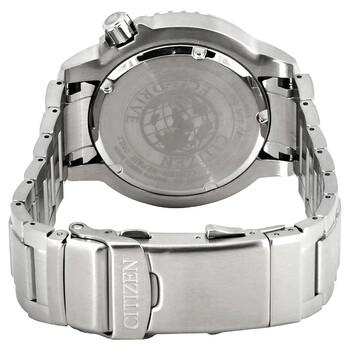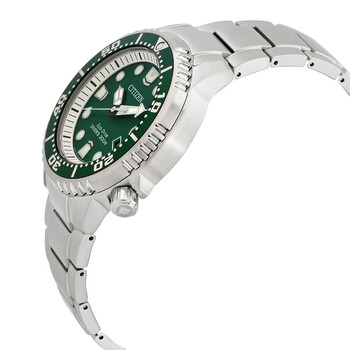 Silver-tone stainless steel case and bracelet. Green dial with silver-tone hands and dots hour markers. Minute markers around the outer rim. Dial Type: Analog. Luminescent hands and markers. Date display at the 4 o'clock position. Eco-drive movement. Scratch resistant mineral crystal. Screw down crown. Solid case back. Round case shape, case size: 44 mm. Deployment clasp. Water resistant at 200 meters / 660 feet. Functions: date, hour, minute, second. Promaster Series. Watch label: Japan Movt. Citizen Promaster Green Dial Men's Watch BN0158-85X.