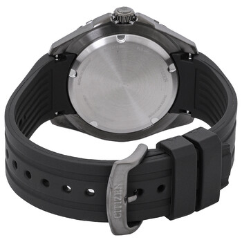 Silver-tone stainless steel case with a black polyurethane strap. Uni-directional rotating silver-tone stainless steel bezel with an inlaid black ring. White dial with black hands and index hour markers. Minute markers around the outer rim. Dial Type: Analog. Luminescent hands and markers. Date display at the 3 o'clock position. Citizen Caliber Eco-Drive E168 eco-drive movement. Scratch resistant mineral crystal. Screw down crown. Solid case back. Round case shape, case size: 44.5 mm, case thickness: 12 mm. Tang clasp. Water resistant at 200 meters / 660 feet. Functions: date, hour, minute, second, solar-powered. Promaster Series. Dive watch style. Watch label: Japan Movt. Citizen Promaster Eco-Drive White Dial Men's Watch BN0197-08A.
