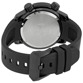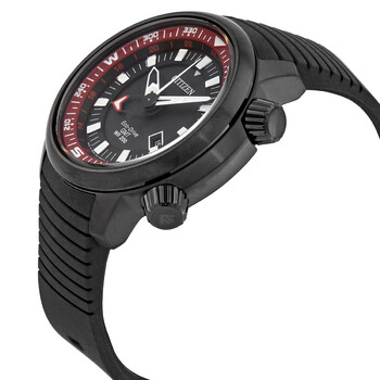 Black-plated stainless steel case with a black rubber strap. Fixed black-plated bezel. Black dial with luminous silver-tone hands and index hour markers. Minute markers. 24 hour markers. 360 degree compass markings around the outer rim. Dial Type: Analog. Luminescent hands and markers. Date display at the 4 o'clock position. Citizen caliber B877 eco-drive movement. Scratch resistant mineral crystal. Screw down crown. Solid case back. Round case shape. Case size: 48 mm. Case thickness: 14.5 mm. Tang clasp. Water resistant at 200 meters / 660 feet. Functions: GMT, second time zone, hour, minute, second, date. Casual watch style. Watch label: Japan Movt. Citizen Promaster Land Black Dial Men's Watch BJ7086-06E.