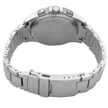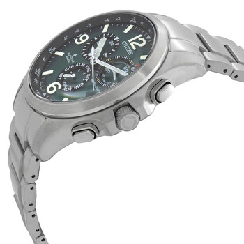 Silver-tone stainless steel case and bracelet. Fixed silver-tone stainless steel bezel. Green dial with silver-tone hands and index-Arabic numeral hour markers. Minute markers around the outer rim. Dial Type: Analog. Luminescent hands and markers. Date display at the 4 o'clock position. Three sub-dials displaying: 24 hour, day/60 second/power reserve indicator , mode. Citizen Caliber E660 eco-drive movement. Scratch resistant sapphire crystal. Solid case back. Round case shape, case size: 43 mm. Band width: 22 mm. Fold over clasp with a safety release. Water resistant at 200 meters / 660 feet. Functions: perpetual calendar, atomic timekeeping, radio controlled, chronograph, world time, alarm, date, day, hour, minute, second, power reserve indicator, solar-powered. Promaster Land Series. Sport watch style. Watch label: Japan Movt. Citizen Promaster Land Chronograph Green Dial Men's Watch CB5921-59X.