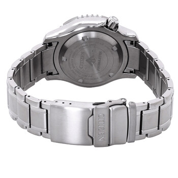 Silver-tone stainless steel case and bracelet. Uni-directional rotating black stainless steel bezel. Blue dial with silver-tone hands and dots hour markers. Minute markers around the outer rim. Dial Type: Analog. Luminescent hands and markers. Day & date display at the 3 o'clock position. Citizen Caliber 8204 automatic movement with a 45-hour power reserve. Scratch resistant mineral crystal. Screw down crown. Solid case back. Round case shape, case size: 42 mm, case thickness: 13.5 mm. Band width: 20 mm. Fold over clasp with a safety release. Water resistant at 200 meters / 660 feet. Functions: date, day, hour, minute, second. Promaster Series. Dive watch style. Watch label: Japan Movt. Citizen Promaster Automatic Blue Dial Men's Watch NY0100-50M.