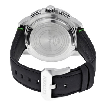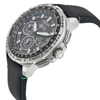 Stainless steel case with a black leather strap. Uni-directional rotating bezel. Black dial with silver-tone hands and index hour markers. Dial Type: Analog. Luminescent hands and markers. Date display between the 4 and 5 o'clock positions. Three sub-dials displaying: 1/20th of a second, 24 hours, and alarm. Eco-Drive F900 eco-drive movement. Scratch resistant sapphire crystal. Screw down crown. Case size: 47 mm. Case thickness: 15 mm. Round case shape. Band width: 22 mm. Tang clasp. Water resistant at 200 meters / 660 feet. Functions: date, hour, minute, second, satellite gps, alarm, perpetual calendar, and chronograph. Additional Info: features 40 time zones, power reserve. Sport watch style. Citizen Promaster Navihawk Black Dial Men's Chronograph Watch CC9030-00E.