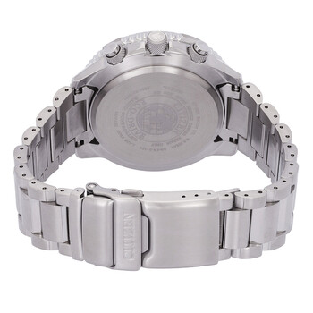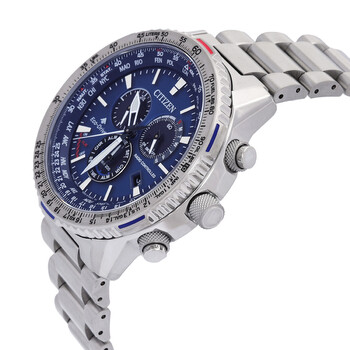 Silver-tone stainless steel case and bracelet. Bi-directional rotating silver-tone stainless steel bezel. Blue dial with silver-tone hands and index hour markers. Minute markers around the outer rim. Dial Type: Analog. Luminescent hands and markers. Perpetual calendar. Three sub-dials displaying: 24 hour, day/60 second/power reserve indicator , mode. Citizen Caliber E660 eco-drive movement. Scratch resistant sapphire crystal. Screw down crown. Solid case back. Round case shape, case size: 47 mm, case thickness: 14 mm. Band width: 22 mm. Deployment with push button release clasp. Water resistant at 200 meters / 660 feet. Functions: perpetual calendar, atomic timekeeping, radio controlled, chronograph, world time, alarm, date, day, GMT, second time zone, hour, minute, second, power reserve indicator, solar-powered. Promaster Series. Sport watch style. Watch label: Japan Movt. Citizen Promaster Perpetual Alarm World Time Chronograph Blue Dial Men's Watch CB5000-50L.