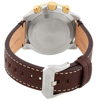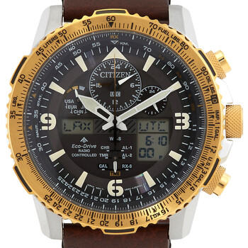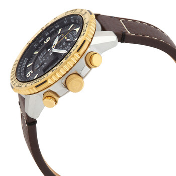 Silver-tone stainless steel case with a brown calf leather strap. Bi-directional rotating gold-tone stainless steel bezel. Black dial with silver-tone hands and index-Arabic numeral hour markers. Arabic numeral marker appears at the 3, 6 and 9 o'clock positions. Minute markers around the outer rim. Dial Type: Analog. Luminescent hands and markers. Perpetual calendar. Chronograph - four sub-dials displaying: charge indicator, dual time, 24 hour, functions. Citizen Caliber Eco-Drive U680 eco-drive movement. Scratch resistant sapphire crystal. Screw down crown. Solid case back. Round case shape, case size: 47 mm, case thickness: 13.9 mm. Tang clasp. Water resistant at 200 meters / 660 feet. Functions: perpetual calendar, chronograph, world time, alarm, GMT, second time zone, hour, minute, second, power reserve indicator, solar-powered. Promaster Series. Sport watch style. Watch label: Japan Movt. Citizen Promaster Perpetual Alarm World Time Chronograph GMT Black Dial Men's Watch JY8084-17H.