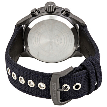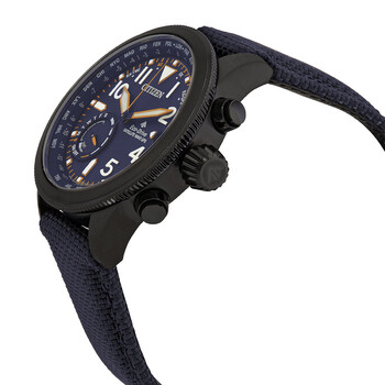 Black-plated stainless steel case with a blue nylon (leather backed) strap. Fixed black-plated stainless steel bezel. Blue dial with luminous orange hands and Arabic numeral hour markers. Minute markers, world timd cities around the outer rim. Dial Type: Analog. Luminescent hands and markers. Date display at the 3 o'clock position. Day of the week sub-dial. Citizen caliber F150 eco-drive movement. Scratch resistant sapphire crystal. Solid case back. Round case shape. Case size: 44 mm. Case thickness: 14.3 mm. Strap width: 22 mm. Tang clasp. Water resistant at 200 meters / 660 feet. Functions: chronograph, date, hour, minute, second. Additional Info: radio controlled atomic receiver. GPS - satellite. Promaster Satellite Series. Casual watch style. Citizen Promaster Satellite Chronograph Blue Dial Men's Watch CC3067-02E.