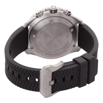 Silver-tone super titanium case with a black polyurethane strap. Uni-directional rotating silver-tone super titanium bezel. Green dial with silver-tone hands and index hour markers. Minute markers around the outer rim. Dial Type: Analog. Luminescent hands and markers. Date display at the 3 o'clock position. Citizen Caliber F158 eco-drive movement. Scratch resistant sapphire crystal. Solid case back. Round case shape, case size: 47 mm. Band width: 22 mm. Buckle clasp. Water resistant at 200 meters / 660 feet. Functions: date, day, hour, minute, second, satellite gps timekeeping system, perpetual calendar. Promaster Series. Dive watch style. Watch label: Japan Movt. Citizen Promaster Satellite Wave GPS Diver Eco-Drive Green Dial Men's Watch CC5001-00W.