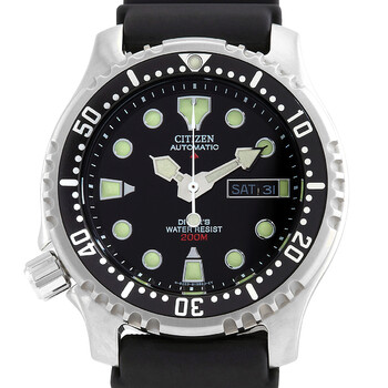 Silver-tone stainless steel case with a black rubber strap. Silver-tone stainless steel bezel. Black dial with luminous white hands and dots-dots hour markers. Minute markers around the outer rim. Dial Type: Analog. Luminescent hands and markers. Day of the week and date display at the 3 o'clock position. Automatic movement with a 45-hour power reserve. Scratch resistant mineral crystal. Screw down crown. Solid case back. Round case shape, case size: 42 mm, case thickness: 12 mm. Band width: 20 mm. Tang clasp. Water resistant at 200 meters / 660 feet. Functions: date, day, hour, minute, second. Promaster Sea Series. Dive watch style. Citizen Promaster Sea Automatic Black Dial Men's Watch NY0040-09E.