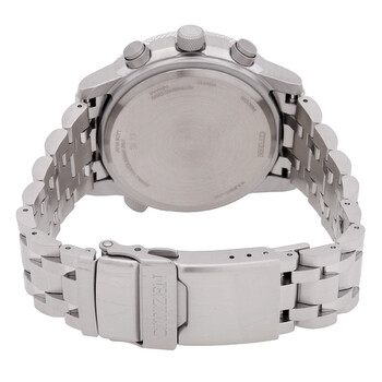 Silver-tone stainless steel case and bracelet. Fixed silver-tone stainless steel bezel. Black dial with silver-tone hands and index hour markers. Minute markers around the outer rim. Dial Type: Analog. Luminescent hands and markers. Date display at the 4 o'clock position. Three sub-dials displaying: 24 hour, day/60 second/power reserve indicator , mode. Citizen Caliber E660 eco-drive movement. Scratch resistant sapphire crystal. Solid case back. Round case shape, case size: 43.7 mm, case thickness: 13.3 mm. Water resistant at 200 meters / 660 feet. Functions: perpetual calendar, atomic timekeeping, radio controlled, chronograph, world time, alarm, date, day, hour, minute, second, power reserve indicator, solar-powered. Promaster Series. Sport watch style. Watch label: Japan Movt. Citizen Promaster Sky Perpetual Alarm Black Dial Men's Watch CB5861-59E.
