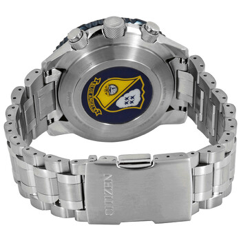 Stainless steel case with a stainless steel bracelet. Bi-directional rotating blue-plated bezel showing conversion markings. Blue dial with luminous silver-tone hands and index hour markers. Arabic numerals marker appears at 3, 6 and 9 o'clock position. Minute markers around the outer rim. Dial Type: Analog-Digital. Luminescent hands. Perpetual calendar. Digital sub-dials. 24 hour (UTC) sub-dial. Citizen caliber U680 eco-drive movement. Scratch resistant sapphire crystal. Screw down crown. Solid case back. Round case shape. Case size: 45.4 mm. Case thickness: 14.5 mm. Band width: 21 mm. Deployment clasp with a push button release. Water resistant at 200 meters / 660 feet. Functions: perpetual calendar, radio-controlled, word time, flying distance and navigation calculations, day, date, month, power reserve indicator, overcharge prevention function, UTC (universal time coordinated), dual time, timer. Promaster Sky Series. Sport watch style. Watch label: Japan Movt. Citizen Promaster Sky Perpetual Blue Dial Men's Watch JY8088-83L.