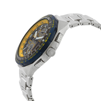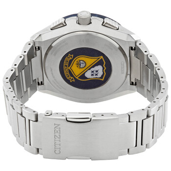 Silver-tone stainless steel case and bracelet. Blue IP stainless steel bezel. Blue dial with silver-tone hands and index-Arabic numeral hour markers. Minute markers around the outer rim. Dial Type: Analog. Luminescent hands and markers. Perpetual calendar. Chronograph - four sub-dials displaying: charge indicator, dual time, 24 hour, functions. Citizen Caliber Eco-Drive U680 eco-drive movement. Scratch resistant sapphire crystal. Screw down crown. Solid case back. Round case shape, case size: 46 mm. Fold over clasp with a safety release. Water resistant at 200 meters / 660 feet. Functions: perpetual calendar, chronograph, world time, alarm, GMT, second time zone, hour, minute, second, power reserve indicator, solar-powered. Promaster Skyhawk A-t Series. Sport watch style. Watch label: Japan Movt. Citizen Promaster Skyhawk A-T Chronograph GMT Eco-Drive Blue Dial Men's Watch JY8125-54L.