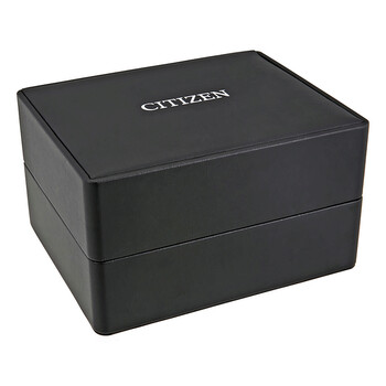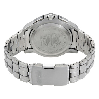 Titanium case with a titanium bracelet. Uni-directional rotating black titanium bezel. Black dial with silver-tone hands and index hour markers. Minute markers. Pilot's slide rule markings around the outer rim. Dial Type: Analog. Luminescent hands and markers. Perpetual calendar. Four displays showing: charge indicator, dual time, 24 hour and functions. Citizen Caliber Eco-Drive U680 quartz movement. Scratch resistant sapphire crystal. Solid case back. Round case shape. Case size: 47 mm. Case thickness: 15 mm. Band width: 24 mm. Fold over clasp with a safety release. Water resistant at 200 meters / 660 feet. Functions: GMT, second time zone, hour, minute, second, perpetual calendar, power reserve indicator. Additional Info: limited to 5000 pieces. Sport watch style. Citizen Promaster Skyhawk A-T Men's Limited Edition Titanium Watch JY8068-56E.