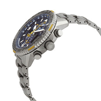 Gray super titanium case and bracelet. Rotating gray super titanium bezel showing slide rule markings. Blue dial with luminous silver-tone hands and index hour markers. Minute markers around the outer rim. Dial Type: Analog. Luminescent hands and markers. Chronograph - sub-dials displaying: digital. Citizen caliber U680 eco-drive movement. Scratch resistant sapphire crystal. Screw down crown. Solid case back. Round case shape. Case size: 45 mm. Deployment clasp. Water resistant at 200 meters / 660 feet. Functions: hour, minute, second, 43 world cities, 1/100 second chronograph, 24 hours, perpetual calendar, power reserve, alarms, countdown timer. Promaster Skyhawk Series. Casual watch style. Citizen Promaster Skyhawk Perpetual Alarm Chronograph Blue Dial Men's Watch JY8101-52L.