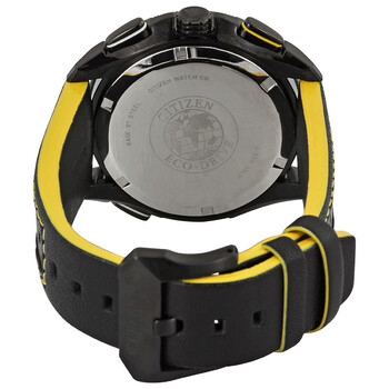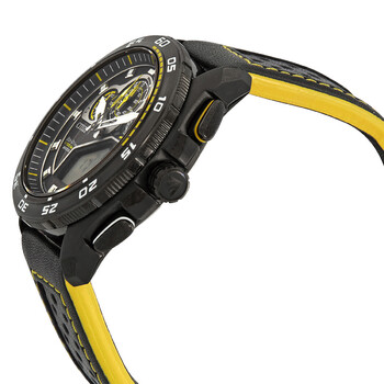 Black stainless steel case with a black-yellow leather strap. Fixed black bezel. Black-digital dial with silver-tone hands and index hour markers. Minute markers around the outer rim. Dial Type: Analog-digital. Luminescent hands and markers. Quartz movement. Scratch resistant sapphire crystal. Solid case back. Round case shape, case size: 44 mm. Tang clasp. Water resistant at 200 meters / 660 feet. Promaster Super Sport Series. Sport watch style. Citizen Promaster Super Sport Quartz Analog-Digital Watch JW0125-00E.