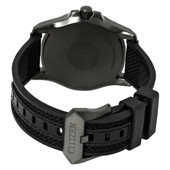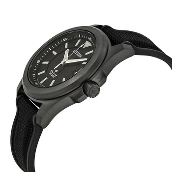 Black ion-plated (surface hardened) stainless steel case with a black fabric strap. Fixed black ion-plated bezel. Black dial with luminous silver-tone hands and index hour markers. Minute markers around the outer rim. Dial Type: Analog. Luminescent hands and markers. Date display at the 3 o'clock position. Citizen Caliber Eco-Drive E168 eco-drive movement. Scratch resistant sapphire crystal. Screw down crown. Solid case back. Round case shape. Case size: 42 mm. Case thickness: 11 mm. Band width: 22 mm. Tang clasp. Water resistant at 200 meters / 660 feet. Functions: date, hour, minute, second, solar-powered. Casual watch style. Watch label: Japan Movt. Citizen Promaster Eco-Drive Tough Black Dial Eco-Drive Black Fabric Men's Watch BN0217-02E.