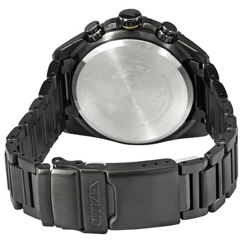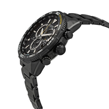 Black stainless steel case and bracelet. Fixed black bezel. Black dial with silver-tone hands and index hour markers. Tachymeter scale around the outer rim. Dial Type: Analog. Luminescent hands and markers. Date display at the 4 o'clock position. Chronograph - sub-dials displaying: days of the week, 12-24 hours, alarm. Citizen Caliber E660 eco-drive movement. Scratch resistant sapphire crystal. Pull / push crown. Solid case back. Round case shape, case size: 45 mm, case thickness: 13 mm. Deployment clasp. Water resistant at 200 meters / 660 feet. Functions: chronograph, date, hour, minute, second, radio controlled, alarm, daylight saving function, world time. Promaster Series. Watch label: Japan Movt. Citizen Promaster Alarm World Time Chronograph Black Dial Men's Watch CB5037-84E.