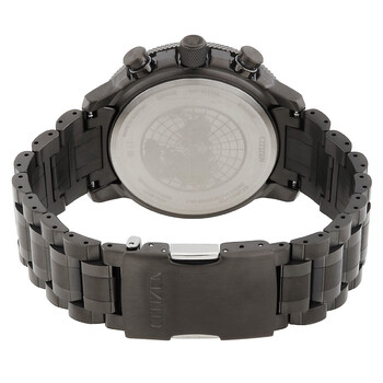Black stainless steel case and bracelet. Fixed black stainless steel bezel. Gray dial with luminous hands and index-Arabic numeral hour markers. Minute markers around the outer rim. Dial Type: Analog. Luminescent hands and markers. Date display at the 4 o'clock position. Three-am-pm/24 hour,world time and day subdials. Citizen Caliber H864 eco-drive movement. Scratch resistant sapphire crystal. Solid case back. Round case shape, case size: 46 mm. Fold over clasp with a safety release. Water resistant at 200 meters / 660 feet. Functions: date, hour, minute, second,power reserve indication,antimagnetic,world time,. Promaster Series. Sport watch style. Watch label: Japan Movt. Citizen Promaster World Time Men's Watch BY3005-56G.