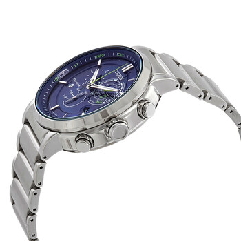 Silver-tone stainless steel case with a silver-tone stainless steel bracelet. Fixed silver-tone stainless steel bezel. Blue dial with silver-tone hands and index hour markers. Minute markers around the outer rim. Dial Type: Analog. Luminescent hands and markers. Perpetual calendar. Chronograph - three sub-dials displaying: 12/24 hour, function, power reserve indicator/day. Citizen Caliber Eco-Drive W770 eco-drive movement. Scratch resistant mineral crystal. Pull / push crown. Solid case back. Round case shape, case size: 46 mm, case thickness: 14.5 mm. Band width: 23 mm. Deployment with push button release clasp. Water resistant at 100 meters / 330 feet. Functions: perpetual calendar, chronograph, alarm, date, day, GMT, second time zone, hour, minute, second, power reserve indicator, Bluetooth, solar-powered. Casual watch style. Watch label: Japan Movt. Citizen Proximity Eco-Drive Perpetual Calender Chronograph Blue Dial Men's Watch BZ1000-54L.