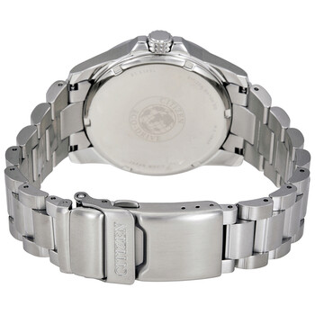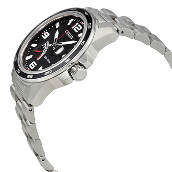 Silver-tone stainless steel case with a silver-tone stainless steel bracelet. Fixed black stainless steel bezel. Black dial with silver-tone hands and index-Arabic numerals hour markers. Minute markers around the outer rim. Dial Type: Analog. Date display at the 3 o'clock position. Citizen Caliber Eco-Drive J850 quartz movement with an 8 month power reserve. Scratch resistant mineral crystal. Solid case back. Case size: 42 mm. Round case shape. Fold over with push button clasp. Water resistant at 100 meters / 330 feet. Functions: date, hour, minute, second, power reserve. Sport watch style. Citizen PRT Black Dial Men's Stainless Steel Watch AW7030-57E.