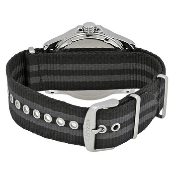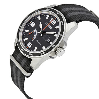 Stainless steel case with a black and grey striped nylon strap. Fixed stainless steel bezel with a black inlay. Black dial with luminous silver-tone hands and index hour markers. Arabic numerals mark the 6, 9 and 12 o'clock positions. Minute markers around the outer rim. Dial Type: Analog. Luminescent hands and markers. Date display at the 3 o'clock position. Power reserve display. Citizen caliber Eco-Drive J850 eco-drive movement with an 8 month power reserve. Scratch resistant mineral crystal. Pull / push crown. Solid case back. Case size: 42 mm. Case thickness: 11 mm. Round case shape. Band width: 20 mm. Band length: 9 inches. Tang clasp. Water resistant at 100 meters / 330 feet. Functions: date, hour, minute, second, power reserve indicator. Sport watch style. Watch label: Japan Movt. Citizen PRT Black Dial Striped Nylon Men's Watch AW7030-06E.