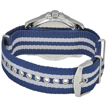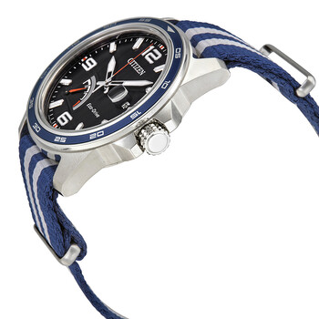Stainless steel case with a two-tone (blue and grey) nylon strap. Fixed stainless steel bezel with a blue ring bezel. Black dial with luminous silver-tone hands and index hour markers. Arabic numerals mark the 6, 9 and 12 o'clock positions. Minute markers around the outer rim. Dial Type: Analog. Luminescent hands and markers. Date display at the 3 o'clock position. Power reserve display. Citizen caliber Eco-Drive J850 eco-drive movement with an 8-months power reserve. Scratch resistant mineral crystal. Solid case back. Round case shape. Case size: 42 mm. Case thickness: 11 mm. Band width: 21 mm. Tang clasp. Water resistant at 100 meters / 330 feet. Functions: date, hour, minute, second, power reserve indicator. Additional Info: featuring Eco-drive technology – powered by light, any light. never needs a battery. Sport watch style. Watch label: Japan Movt. Citizen PRT Eco-Drive Power Reserve Black Dial Men's Watch AW7038-04L.