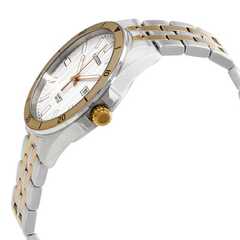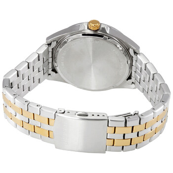 Stainless steel case with a two-tone (silver-tone and gold-tone) stainless steel bracelet. Fixed stainless steel bezel with an inlaid gold ring. Beige dial with luminous gold-tone hands and index hour markers. Minute markers around the outer rim. Dial Type: Analog. Luminescent hands and markers. Date display at the 3 o'clock position. Citizen caliber G111 quartz movement. Scratch resistant mineral crystal. Pull / push crown. Solid case back. Round case shape. Case size: 42 mm. Case thickness: 10 mm. Band width: 21 mm. Fold over clasp with a push button release. Water resistant at 100 meters / 330 feet. Functions: date, hour, minute, second. Casual watch style. Citizen Quartz Beige Dial Two-tone Men's Watch BI5056-58A.