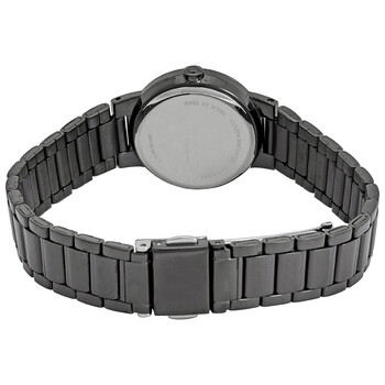 Black ion plated stainless steel case and bracelet. Fixed black ion-plated bezel. Black dial with silver-tone dauphine-style hands and index hour markers. Dial Type: Analog. Date display at the 6 o'clock position. Quartz movement. Scratch resistant mineral crystal. Pull / push crown. Solid case back. Round case shape. Case size: 27 mm. Case thickness: 8 mm. Band width: 16 mm. Fold over clasp with a push button release. Water resistant at 50 meters / 165 feet. Functions: date, hour, minute, second. Casual watch style. Watch label: Japan Movt. Citizen Quartz Black Dial Black Ion-plated Ladies Watch EU6017-54E.