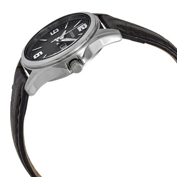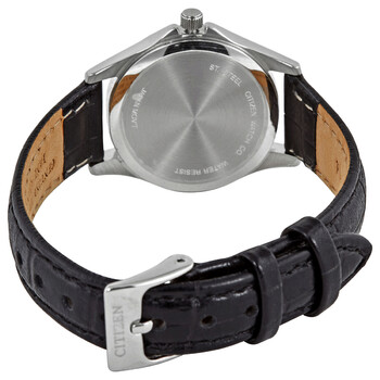 Stainless steel case with a black leather strap. Fixed stainless steel bezel. Black dial with luminous silver-tone hands and index hour markers. Arabic numerals mark the 6, 9 and 12 oclock positions. Minute markers around the outer rim. Dial Type: Analog. Luminescent hands. Day of the week and date display at the 3 o'clock position. Quartz movement. Scratch resistant mineral crystal. Pull / push crown. Solid case back. Round case shape. Case size: 27 mm. Case thickness: 9 mm. Band width: 14 mm. Tang clasp. Water resistant at 30 meters / 100 feet. Functions: date, day, hour, minute, second. Casual watch style. Watch label: Japan Movt. Citizen Quartz Black Dial Black Leather Ladies Watch EQ0591-13E.