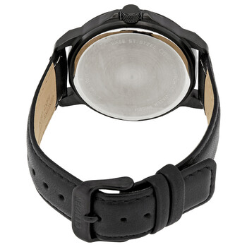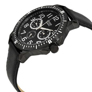 Black stainless steel case with a black leather strap. Fixed black stainless steel bezel. Black dial with luminous silver-tone hands and Arabic numeral hour markers. Minute markers around the outer rim. Dial Type: Analog. Luminescent hands. Date display at the 3 o'clock position. Three multi-function sub-dials displaying: 24 hours, date and day of the week. Citizen caliber 6329 quartz movement. Scratch resistant mineral crystal. Pull / push crown. Solid case back. Round case shape. Case size: 42 mm. Case thickness: 9.5 mm. Band width: 20 mm. Tang clasp. Water resistant at 30 meters / 100 feet. Functions: date, day, GMT, second time zone, hour, minute, second. Casual watch style. Watch label: Japan Movt. Citizen Quartz Black Dial Black Leather Men's Watch AG8315-04E.