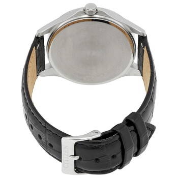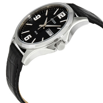 Stainless steel case with a black leather strap. Fixed stainless steel bezel. Black dial with luminous silver-tone hands and index hour markers. Arabic numerals mark the 6, 9 and 12 o'clock positions. Minute markers around the outer rim. Dial Type: Analog. Luminescent hands and markers. Day of the week and date display at the 3 o'clock position. Quartz movement. Scratch resistant mineral crystal. Pull / push crown. Solid case back. Round case shape. Case size: 40 mm. Case thickness: 9 mm. Band width: 18 mm. Tang clasp. Water resistant at 50 meters / 165 feet. Functions: date, hour, minute, second. Casual watch style. Watch label: Japan Movt. Citizen Quartz Black Dial Black Leather Men's Watch BF2001-04E.