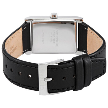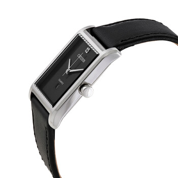 Stainless steel case with a black leather strap. Fixed stainless steel bezel. Black dial with silver-tone hands. A single crystal accent is set at the 12 o’clock position. Dial Type: Analog. Date display above the 6 o'clock position. Citizen Caliber G011 quartz movement. Scratch resistant mineral crystal. Pull / push crown. Solid case back. Rectangle case shape. Case size: 26 mm. Case thickness: 6.9 mm. Band width: 20 mm. Tang clasp. Water resistant at 30 meters / 100 feet. Functions: date, hour, minute, second. Dress watch style. Watch label: Japan Movt. Citizen Quartz Black Dial Black Leather Men's Watch BH3001-14H.