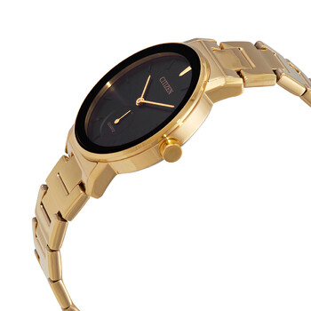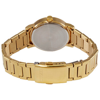 Gold-tone stainless steel case and bracelet. Fixed gold-tone bezel. Black dial with gold-tone hands and index hour markers. Dial Type: Analog. One subdial displaying: small second. Calibre 1045 quartz movement. Scratch resistant mineral crystal. Pull / push crown. Solid case back. Round case shape. Case size: 34 mm. Case thickness: 8 mm. Band width: 18 mm. Fold over clasp with a push button release. Water resistant at 50 meters / 165 feet. Functions: hour, minute. Dress watch style. Citizen Quartz Black Dial Gold-tone Ladies Watch EQ9062-58E.