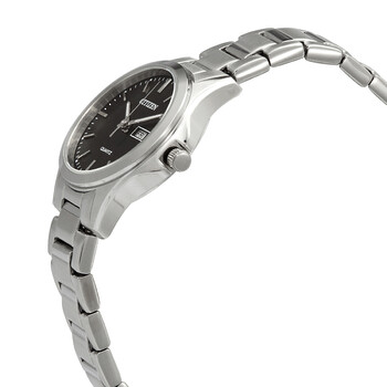 Stainless steel case with a stainless steel bracelet. Fixed stainless steel bezel. Black dial with luminous silver-tone hands and index hour markers. Minute markers around the outer rim. Dial Type: Analog. Luminescent hands and markers. Day of the week and date display at the 3 o'clock position. Citizen caliber 1002 quartz movement. Scratch resistant mineral crystal. Pull / push crown. Solid case back. Round case shape. Case size: 27.5 mm. Case thickness: 7 mm. Band width: 14 mm. Deployment clasp with a push button release. Water resistant at 50 meters / 165 feet. Functions: date, day, hour, minute, second. Dress watch style. Watch label: Japan Movt. Citizen Quartz Black Dial Ladies Silver-tone Watch EQ0591-81E.