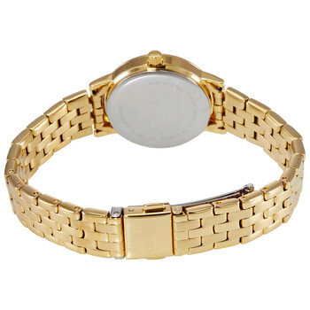 Gold-tone stainless steel case and bracelet. Fixed gold-tone bezel. Black dial with gold-tone hands and index hour markers. Dial Type: Analog. Date display at the 3 o'clock position. Quartz movement. Scratch resistant mineral crystal. Push / pull crown. Solid case back. Round case shape, case size: 28 mm, case thickness: 7 mm. Band width: 14 mm. Fold over clasp with a safety release. Water resistant at 50 meters / 165 feet. Functions: hour, minute, second. Dress watch style. Watch label: Japan Movt. Citizen Quartz Black Dial Ladies Stainless Steel Gold-tone Watch EU6092-59E.