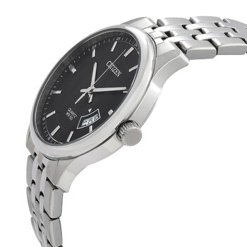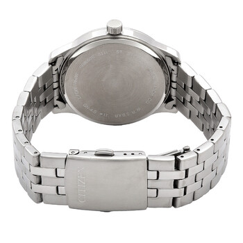 Silver-tone stainless steel case and bracelet. Fixed silver-tone bezel. Black dial with silver-tone hands and index hour markers. Dial Type: Analog. Date display at the 4 o'clock position. Quartz movement. Scratch resistant mineral crystal. Pull / push crown. Solid case back. Round case shape, case size: 40 mm. Deployment clasp. Water resistant at 50 meters / 165 feet. Functions: date, hour, minute, second. Citizen Quartz Black Dial Men's Watch BI1050-81E.